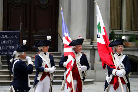 Men dressed in 18th-century military uniforms parade through a historic town. The group carries flags and marches alongside a cannon, marking a celebration of independence.