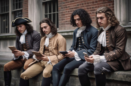 Four male actors are dressed in historical costumes and look into their spartphones.