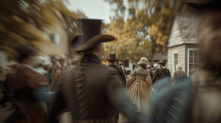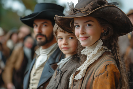 A family dressed in 19th-century attire smiles during a historical reenactment in a rustic outdoor setting