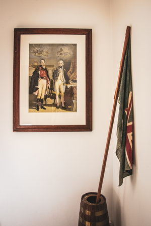 Naval themed artwork on a wall of a home with an old Ensign naval flag by its side