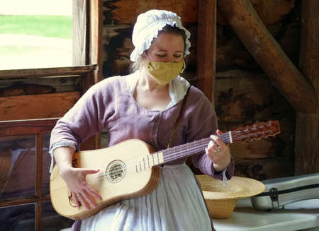 Williamsburg, Virginia, U.S.A - June 30, 2020 - A lady in colonial costume performing a guitar and wearing a mask