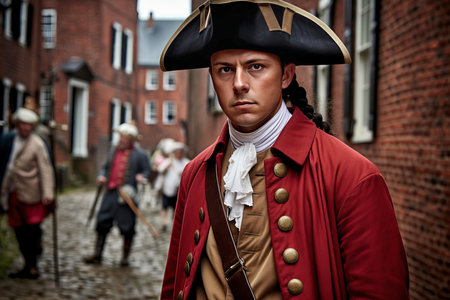 shot of a man in colonial clothing at a historic fort, created with generative ai