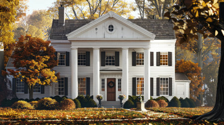 a serene white colonial house nestled within a peaceful neighborhood, capturing the charm of suburban tranquility