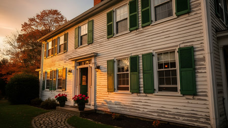 A charming, traditional **white clapboard colonial house** with peeling paint and dark **green shutters** is illuminated by the warm, golden light of **sunset**. A curved cobblestone path leads to the front door, framed by autumn trees with orange foliage.