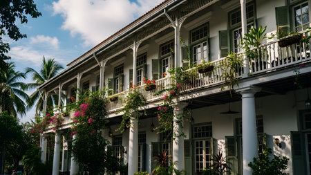 A grand colonial-style building features a long veranda with white pillars and green shutters. Colorful bougainvillea and potted plants adorn the balcony, adding vibrant life to the historic architecture under a blue sky.