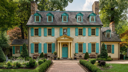 This stunning colonial style house features colorful shutters and a beautifully landscaped garden, set against a serene outdoor backdrop.