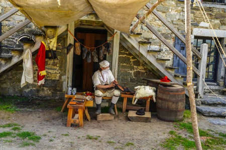 TICONDEROGA, NEW YORK - AUGUST 23, 2020: Reenactor at the historic Fort Ticonderoga in Upstate New York. Fort Ticonderoga, formerly Fort Carillon, is a large 18th-century star fort built by French