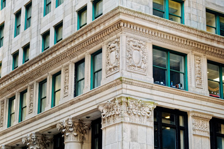 Cinematic view of classic downtown building architecture with textured details and urban street environment.