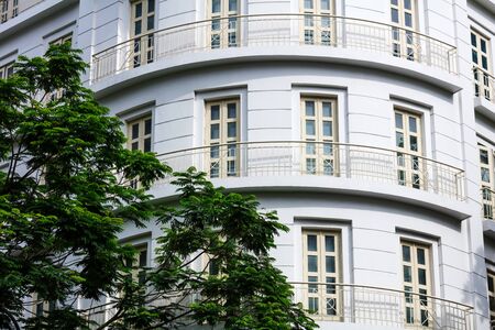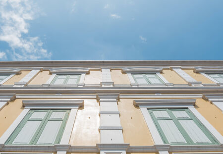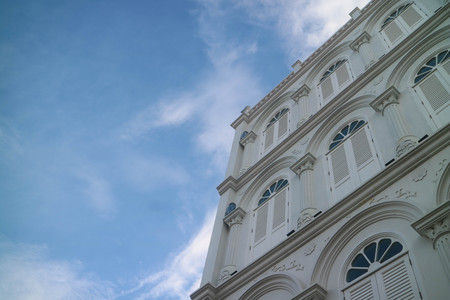 Bottom up view of white architecture building. Facade of building. Wooden door and window. Classic and vintage style building. Exterior building architecture design.