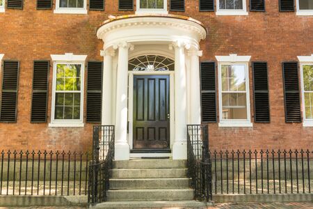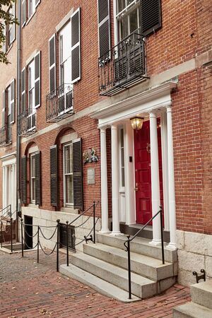 Boston, Massachusetts - October 3rd, 2019: Exterior of brownstone buildings with red door on Chestnut Street in Beacon Hill