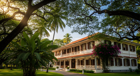 Classic colonial-style building with white columns and a grand entrance. --ar 16:9 --v 6.1 Job ID: 28912805-b48c-4919-a9af-ebf9aafba5c6