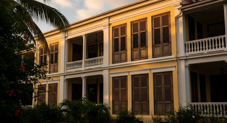 A historic yellow colonial building featuring rows of wooden shuttered windows and white columns. The tropical setting with palm trees suggests a heritage site in Southeast Asia or the Caribbean.