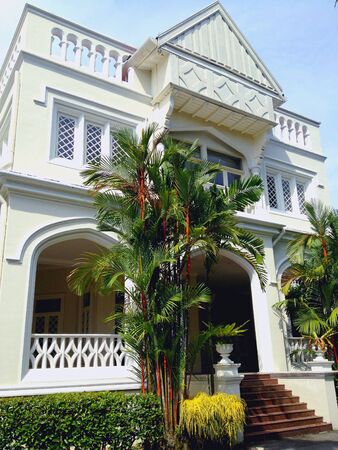 Pondicherry, India - February 2020: Beautiful French architecture of a house painted grey and white and pale blue doors in the old quarter of Pondicherry.