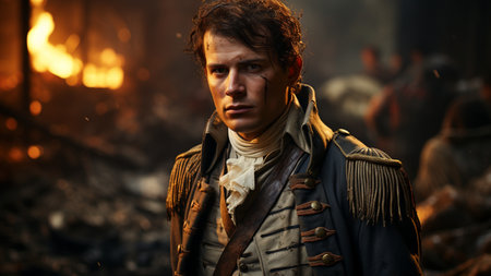 Epic depiction of an iconic soldier in the american revolution amidst a war torn battlefield scene