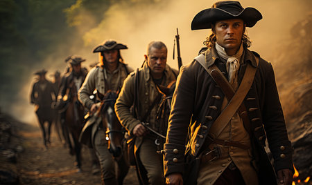 A group of colonial American soldiers march proudly, carrying their nation's flag high. The scene evokes feelings of patriotism and national pride.