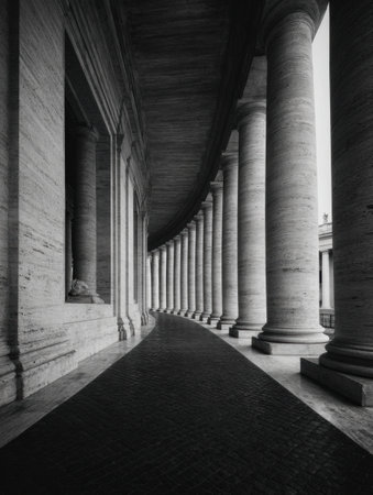 A monochrome corridor lined with tall columns, leading to a dark doorway, creating a sense of depth and architectural elegance.