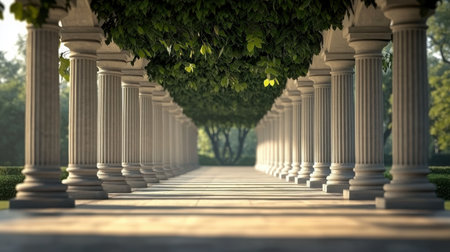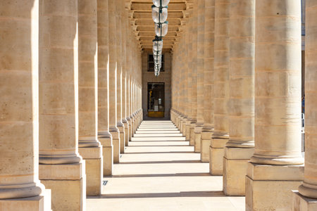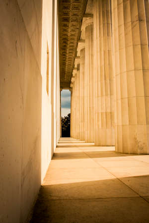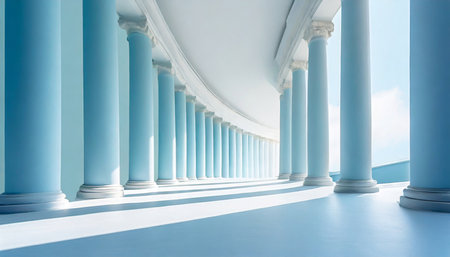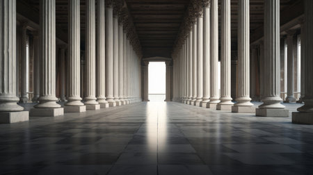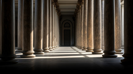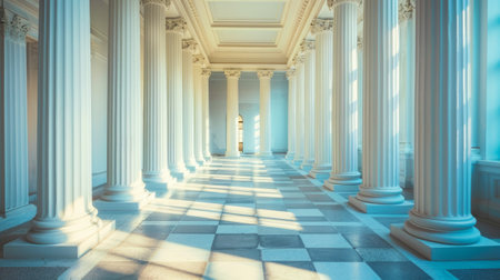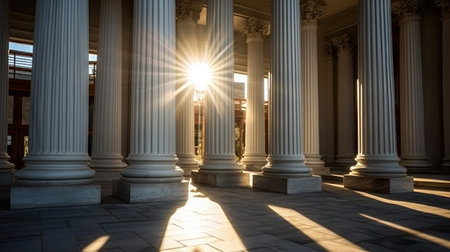 Architectural interior view featuring rows of fluted columns, creating a symmetrical perspective. Sunlight streams across the scene, highlighting the textures and forms, while deep shadows define the space. The composition suggests a historic or governmental setting, suitable for various editorial and commercial applications.