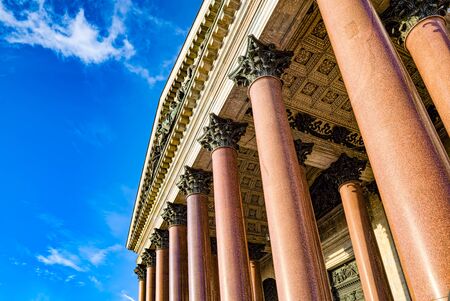 Corinthian columns of Kazan Cathedral, Saint-Petersburg, Russia. Action. Bottom view of the beautiful colonnade of Russian Orthodox Church, concept of architecture.