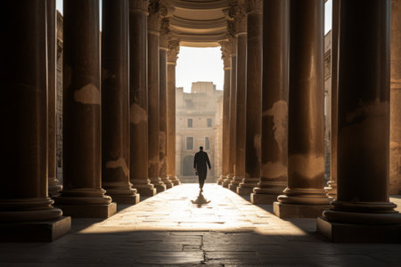 An imposing architectural composition showcases a colonnaded entrance featuring marble flooring. Tall, fluted columns support the structure, leading to a wooden door. The interplay of light and shadow highlights the textures. Suitable for illustrating history, design, or cultural themes, and suitable for a variety of media uses.