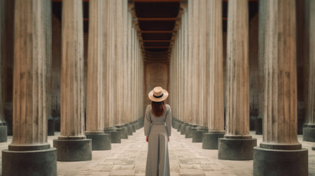 A grand hall adorned with towering columns stretches into the distance, bathed in soft, golden light that filters through an archway. The polished marble floor reflects the elegance of the architecture, creating a tranquil atmosphere that invites contemplation and awe.