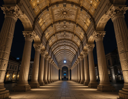 A nighttime view showcases a long perspective of columns. Warm tones illuminate the stone structure under a dark sky. The symmetrical composition emphasizes the repeating architectural elements. This image is suitable for various commercial uses, including artistic prints and architectural documentation.
