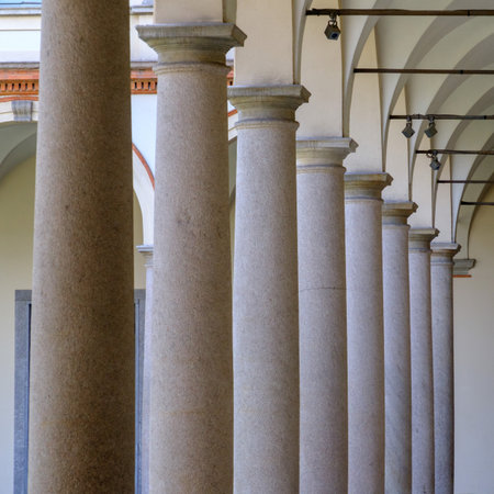 Row of architectural columns in historical archway.