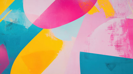 Bright and vibrant abstract composition featuring diagonal blocks of pink, yellow, blue, and green, creating a modern geometric design.