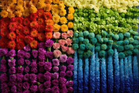 rainbow gradient formed by rows of different flowers, created with generative ai