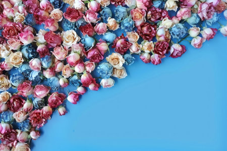 Colorful flowers composition on blue background. Flat lay, top view. generative ai
