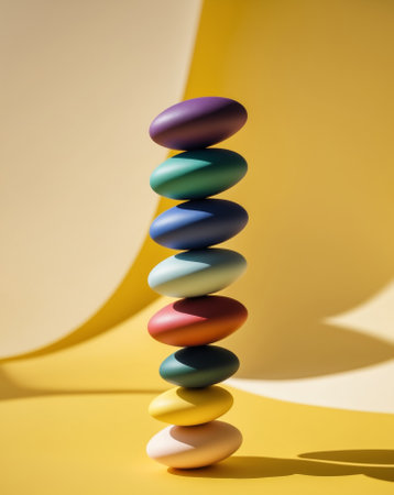 This image showcases a colorful arrangement of stacked stones against a soft pastel background, emphasizing balance and tranquility in modern art design.