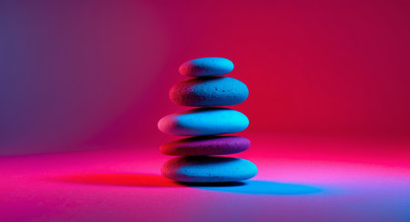 A stack of smooth, round stones balanced precariously under vibrant neon lights. Perfect visual for yoga, meditation, balance, and mindfulness concepts.