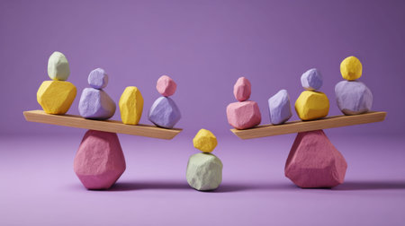 This artwork features a playful arrangement of colorful geometric stones, symbolizing balance and harmony against a soft purple background, ideal for creative projects.