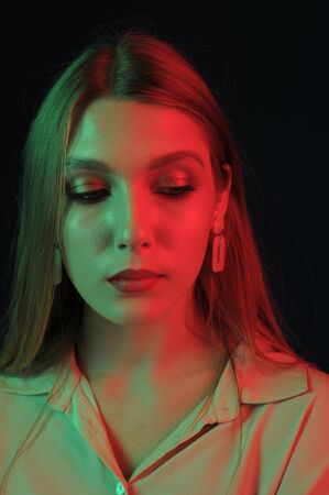 Beautiful, glamorous, girl, model in a photo studio with color filters. Portrait, beauty, style. Girl in a photo studio with a yellow filter. A girl of 18 years old with blond hair and beautiful eyes.