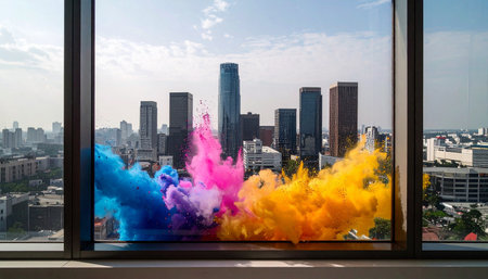 A vibrant explosion of pink and orange dust creates a stunning visual contrast against a bright blue sky, evoking feelings of joy and celebration.
