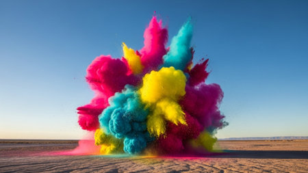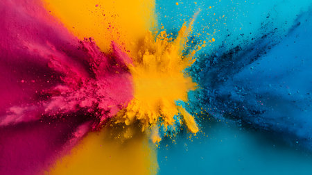 A stunning explosion of vibrant colored powder creates an abstract and dynamic backdrop, perfect for projects needing a bright and energetic touch.