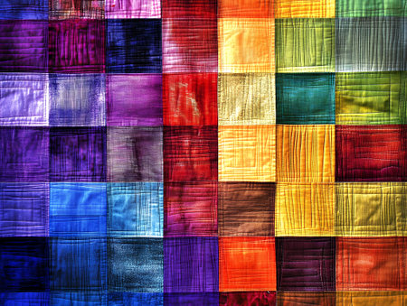 A detailed close-up of colorful quilted fabric showcasing bright patches and intricate stitching, perfect for creative projects or artistic backgrounds.