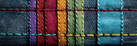 Close-up view of textured denim fabric featuring bright and colorful stitching, highlighting the craftsmanship and design elements of the material.