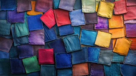 A visually striking arrangement of colorful textile fabric squares showcases a variety of hues and textures, ideal for design and art projects.