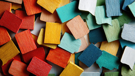 An overhead view displays a collection of colorful wooden squares, arranged in a visually engaging pattern. The squares showcase a variety of hues, ranging from reds and oranges to greens and blues. The overall composition is textured, with natural lighting. This image may be used for various commercial or editorial applications.