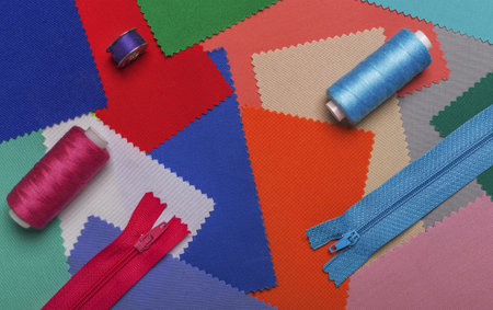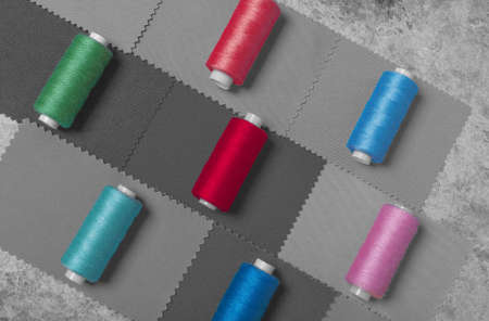 Colored threads on bobbins and multi-colored pieces of fabric.