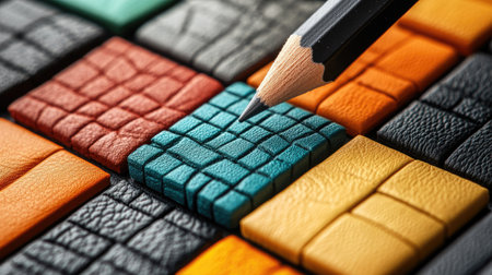 Collection of miniature, square leather samples, displayed in a variety of colors and textures. A graphite pencil rests on one of the teal colored samples. The image focuses on the intricate patterns and detailed surface textures of the leather swatches. The vibrant colors and the sharp focus highlight the craftsmanship or artistry in the design and production of leather samples.