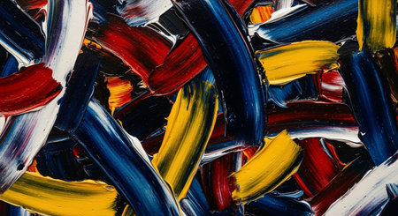 Bold swathes of oil paint in red, blue, yellow, and orange create a captivating visual on canvas, reflecting an artist's dynamic style and creative expression.