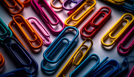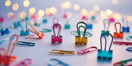 Colorful paper clips arranged on a table with sparkling lights in the background creating a vibrant office setting