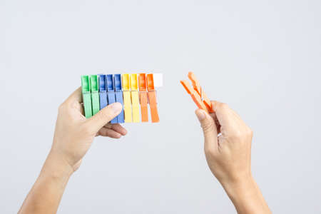 Hand holding row of colorful plastic cloth clamp or clip on white background