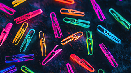 A stunning array of vibrant clothespins arranged artistically on a dark surface, showcasing vivid colors and providing a visually pleasing and creative backdrop.