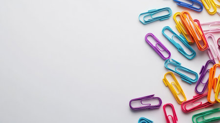 A collection of scattered colorful paperclips on a white desk, symbolizing organization and the structuring of ideas, with space for text