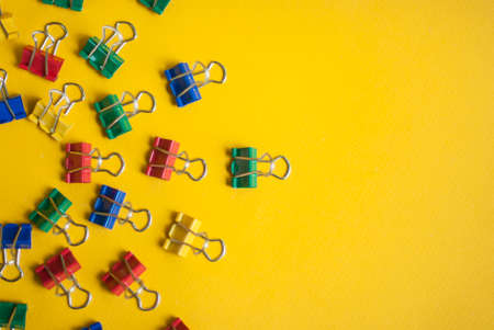 Colorful background with office supplies. Paper clips on a bright yellow background. The concept of a new school year at school. Abstract background from bright paper clips. Office tools