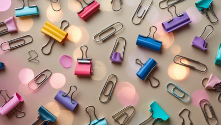 Colorful clips and fasteners arranged creatively on a bright surface with blurred lights in the background