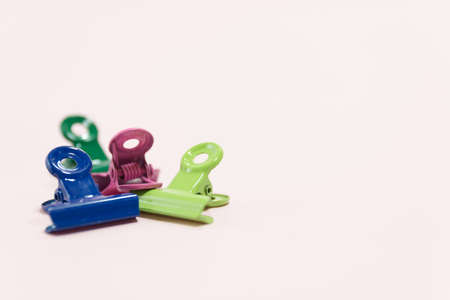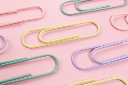 a group of vivid color office metal paper clips for paper on the pale pink mono colour background. minimalism style, top view shot.