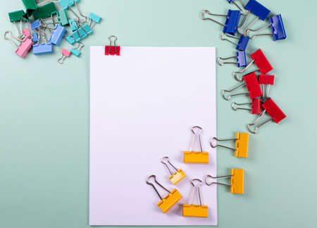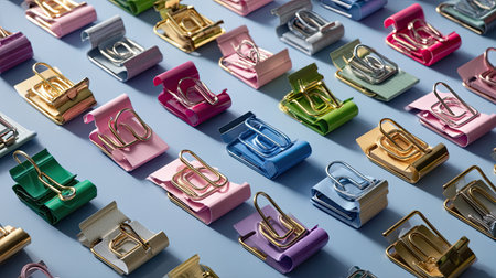 A vibrant collection of colorful office supplies, including various paper clips and binder clips, artfully arranged on a soft blue background.